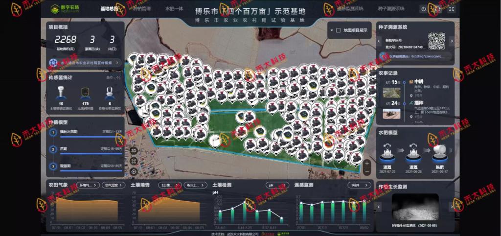 禾大科技作為國內數字農業領域的先行者,利用數字化技術和產品,打造棉花制種基地數字農業平臺,助力新疆博樂市農業農村局博樂市制種示范基地建設項目。該項目通過數字化技術和技術,構建天、空、地一體化的生態環境監測體系,融合物聯網、大數據、人工智能、5G等前沿科技,建設種植管理系統、水肥一體化系統、遙感監測系統、種子溯源系統,實現制種基地從環境數據、企業信息、種植品種定位、品牌建設、種子流通和質量追溯環節的信息采集,實現種子生產的智能化管理和質量安全監控,有效保障種子的安全,同時有效提升種子質量。同時,打造棉花制種示范基地“一張圖”,在烏日木則格得村村委會一樓大會議室,可以看到電子大屏上正實時更新基地的各項實時動態。