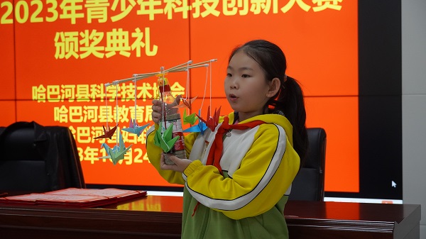 活動現場,哈巴河縣科協負責人向獲獎學生和老師發放榮譽證書及獎品,獲獎學生代表和老師代表發表獲獎感言。