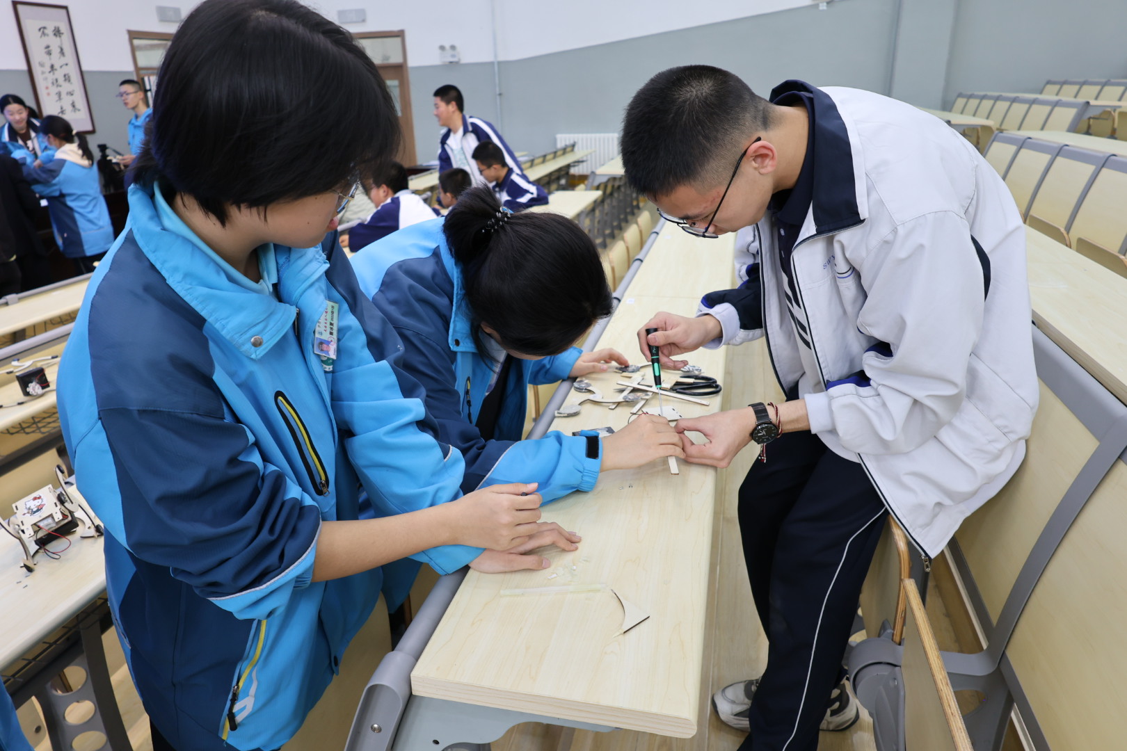 比賽現場異常火爆,同學們還從家里帶來了連接配件的熱熔膠和螺絲釘,在現場自己動手對“未來太空車”進行賽前調整。