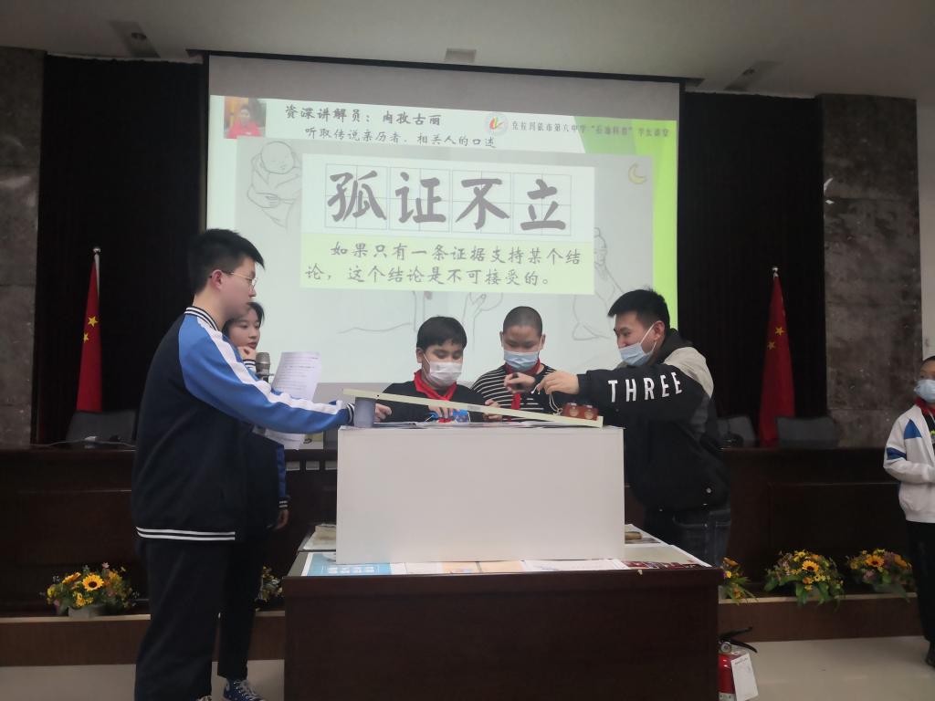 與以往專業講座不同的是,本次講座的主講人是來自第六中學高二的兩名學生。講座生動有趣,形式多樣。活動由一段視頻播放的關于黑油山之問開始,激發了學生的好奇心。隨后主講人通過引導提出問題、查閱文獻、聽取相關人口述等科學論證方式,采用現場互動問答、石油科學小實驗等形式,讓臺上動手操作的同學樂在其中,臺下的學生聽得津津有味。