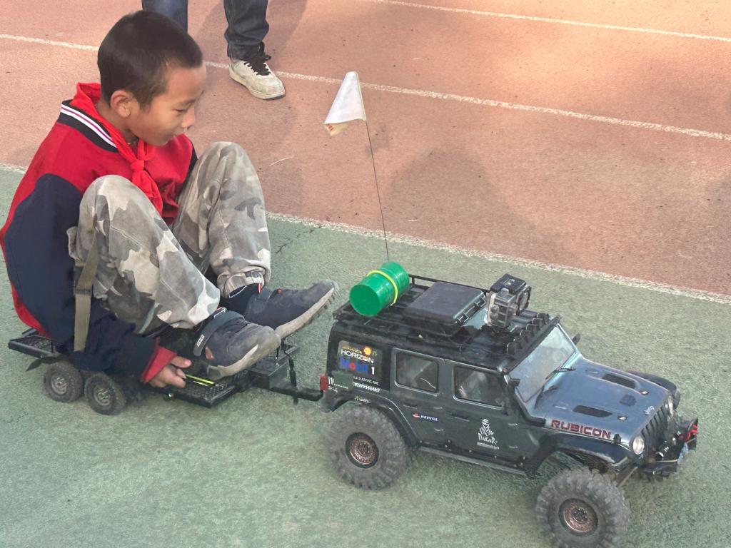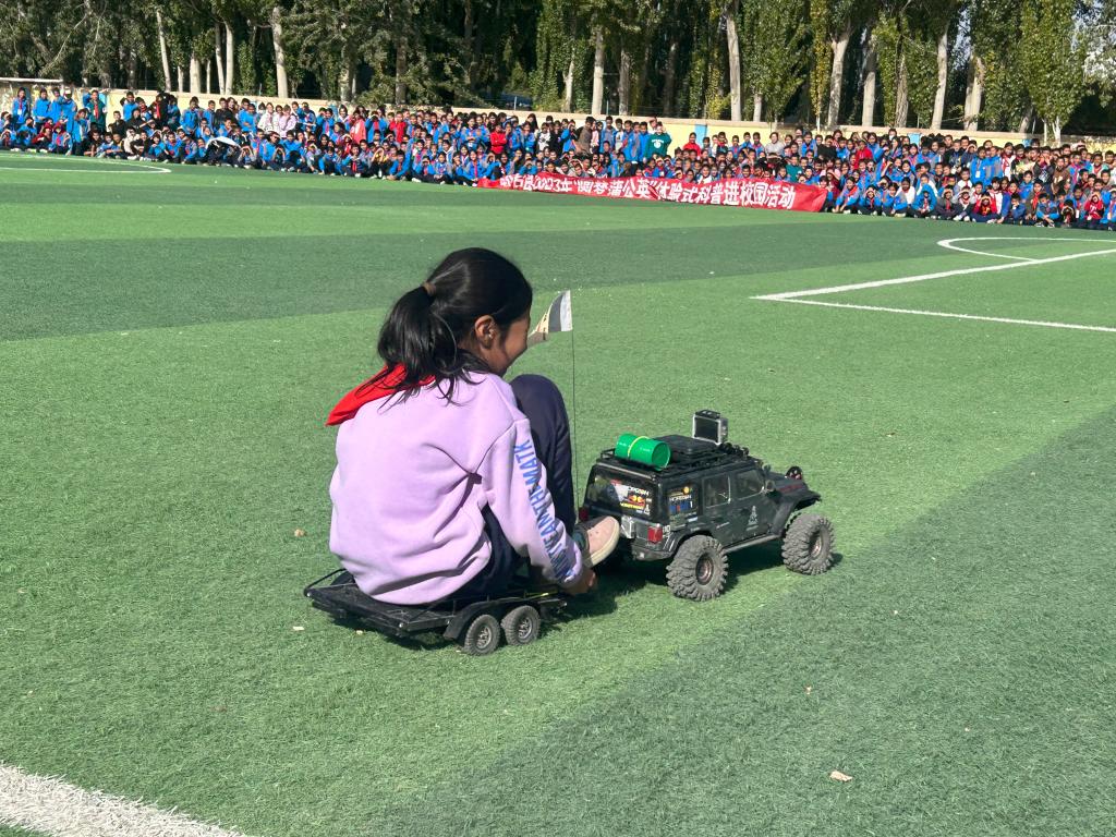 活動現場,最先映入眼簾的是滿載“高科技”的科普大篷車和整整齊齊擺在操場上的各種航模、車模和巴州科協“應急安全”主題流動科普巡展展品。活動特邀請巴州遙控模型運動協會飛行教練張佰戰老師,帶領兩名科技輔導員和科技小先鋒,為大家展示了全地形越野大腳車、牧馬人攀爬車、蘇27戰斗機模型等各種車模和航模、各種高難度動作,讓學校操場成了歡樂的海洋。不同機型的航模在天空上不停地翻轉、懸停、倒飛、噴著彩煙;會跳舞的機器人隨著音樂翩翩起舞……孩子們看著從未見過的科普展教具,新奇不已、歡呼雀躍,處處充滿了歡聲笑語。他們邊參觀邊興奮地體驗科技的神奇,切身體會科技的魅力,場面熱鬧非凡。