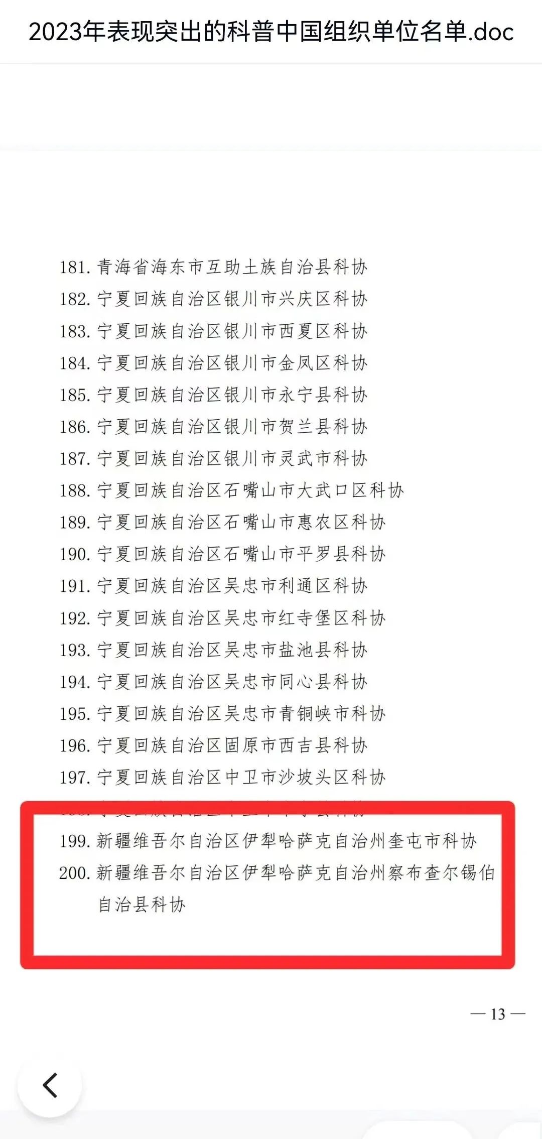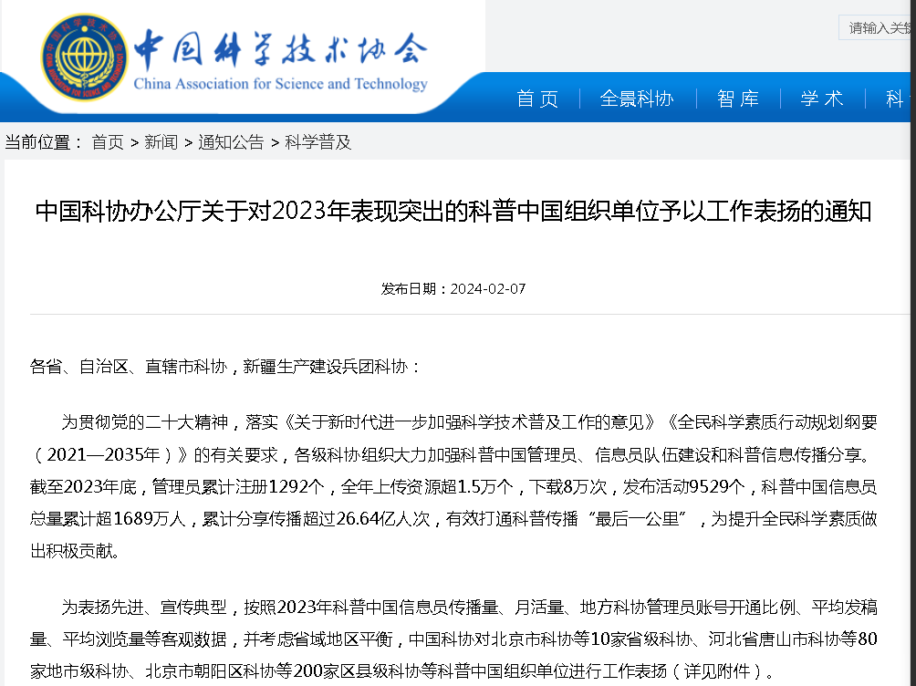 2024年2月7日,中國(guó)科協(xié)官網(wǎng)發(fā)布《中國(guó)科協(xié)辦公廳關(guān)于對(duì)2023年表現(xiàn)突出的科普中國(guó)組織單位予以工作表?yè)P(yáng)的通知》,依據(jù)“科普中國(guó)”官方平臺(tái)信息員注冊(cè)量、月活量、傳播量等數(shù)據(jù),對(duì)10家省級(jí)科協(xié)、80家地市級(jí)科協(xié)、200家區(qū)縣級(jí)科協(xié)進(jìn)行工作表?yè)P(yáng),奎屯市科協(xié)獲評(píng)2023年表現(xiàn)突出的科普中國(guó)組織單位。