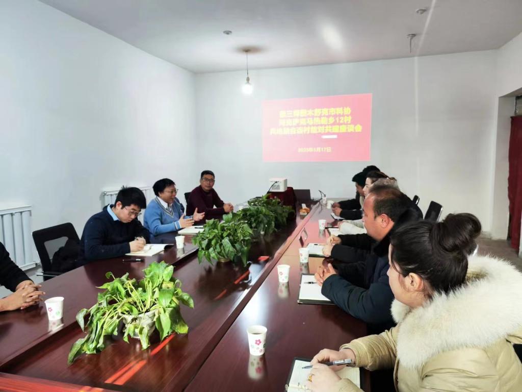 兵團第三師科協主席張素玲一行4人與阿克薩克馬熱勒鄉常務副鄉長穆開熱木·克比爾及博爾其墩(12村)兩委班子成員召開了座談會,針對今年的兵地共建重點工作進行了交流討論,雙方對農業技術培訓、組織農民赴圖市務工、干部交流任職、參觀圖市產業園等內容達成共識。