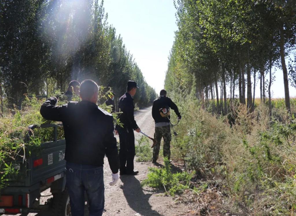 在工作中,轄區群眾反映,在森林公園林場附近,有大量野生大麻生長。民警及科技志愿者立即前往進行核查,經核查發現,在森林公園林場附近的大麻是野生生長,并非人工種植。為防止有不法分子將其流入社會而造成危害,民警及科技志愿者對其進行了及時鏟除,此次共鏟除大麻原植物2000余株。