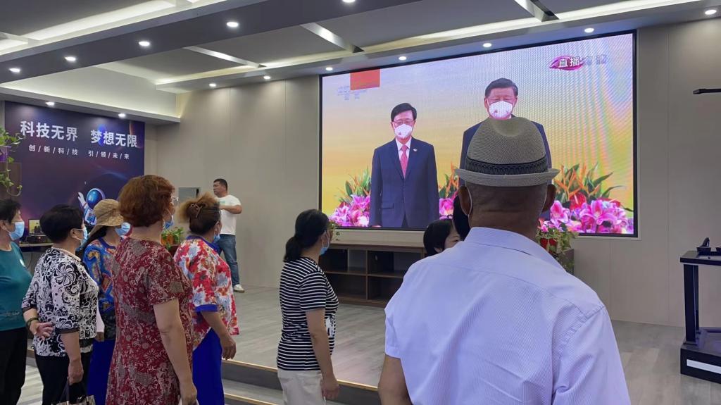 來自和靜縣僑聯的參觀人員首先在科普館影片播放區觀看了“慶祝香港回歸祖國25周年大會暨香港特別行政區第六屆政府就職典禮”現場直播,聆聽了習近平總書記在大會上的重要講話。