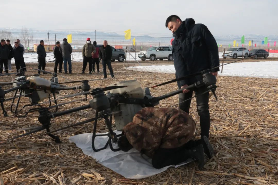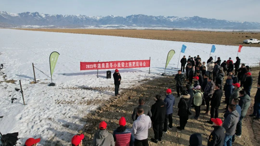 冬小麥雪上施肥現場會現場會上,博州農業技術推廣中心專家就今年冬小麥苗情況進行科學分析,開展了冬小麥現場觀摩深施化肥技術指導及春季田間管理技術指導,重點圍繞做好雪上施肥、適時滴水施肥、合理化控化除等冬麥管理技術要點,對現場參會人員做了面對面、一對一的技術指導。利用無人機進行冬小麥雪墑追肥作業會后,農技人員現場示范利用無人機進行冬小麥雪墑追肥作業。小巧的無人機在麥田中往返穿飛,當積雪即將融化,雪層厚度為5-8cm時,采用無人機撒肥,隨雪層一同融化滲入到麥田中,起到壯苗、增產的作用。