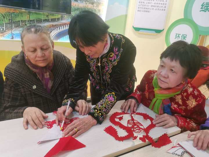 活動現場徐金蓮老師首先向大家講述了剪紙作為一門傳統文化的歷史和發展過程,說明了剪紙是我國最古老的民間藝術之一,可用于點綴墻壁、門窗、鏡子和燈籠,也可作為禮品贈送他人。接下來,老師以現場示范的方式、對如何折紙、如何畫圖、如何裁剪等細節問題進行了詳細的講解和演示,通過老師的一步步細致的講解,大家聽得津津有味,學員們拿起紅紙和剪刀,按照老師傳授的技法和步驟,嘗試著動手剪紙,構思、折疊、剪裁,并在剪紙過程中遇到難題時互相討論,互幫互助,在徐老師的耐心指導下,一張張紅紙在居民們的手中變成了一個個喜字、五角星、雙龍騰飛等。看著自己的勞動成果,居民們臉上露出了開心的微笑。