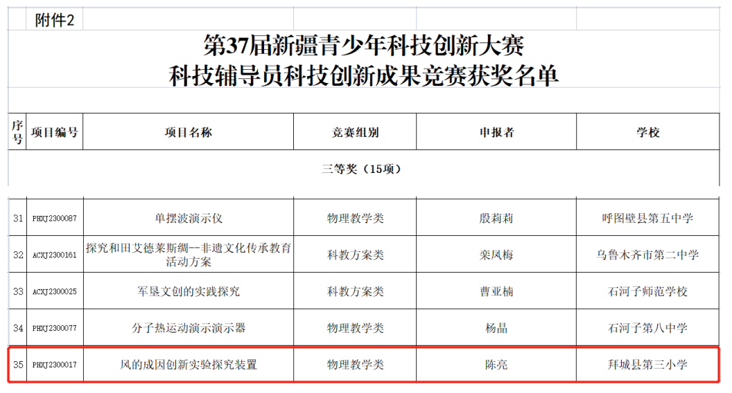 近日,第37屆新疆青少年科技創新大賽終評結果揭曉。在科技輔導員科技創新成果競賽中,拜城縣三小學輔導員陳亮的參賽作品《風的成因創新實驗探究裝置》項目獲得三等獎。