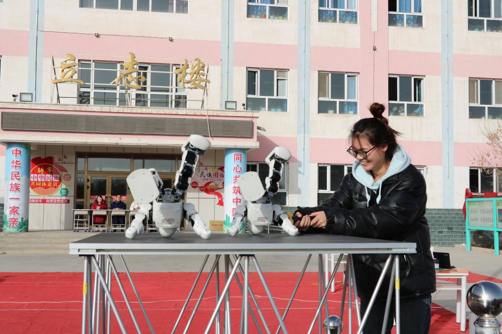 藍(lán)天白云,秋高氣爽,全體師生與觀摩家長齊聚操場,飽覽一場科技盛宴。活動現(xiàn)場和碩縣科協(xié)科普大篷車帶來的機(jī)器人進(jìn)行了表演。機(jī)器人帶來了一段熱舞,整齊劃一的步伐,還來了一個翻跟頭,同學(xué)們興奮地大聲喊:太帥了,太精彩了!3D打印機(jī)、人工智能機(jī)械臂、無人機(jī)等展示,讓同學(xué)們目不暇接,感受科技帶來的魅力。買吾魯提·艾合買提老師帶領(lǐng)學(xué)生展示的火山噴發(fā)、無字天書,以及康逢權(quán)老師展示的火焰掌引爆了全場。同學(xué)們的歡呼聲、驚嘆聲響徹校園。學(xué)生還觀看科普大篷車并帶去了科普展板、體驗科普展品,研學(xué)學(xué)生展示自己做的蝴蝶標(biāo)本。最后一年級小學(xué)生進(jìn)行“放飛夢想”紙飛機(jī)比賽。
