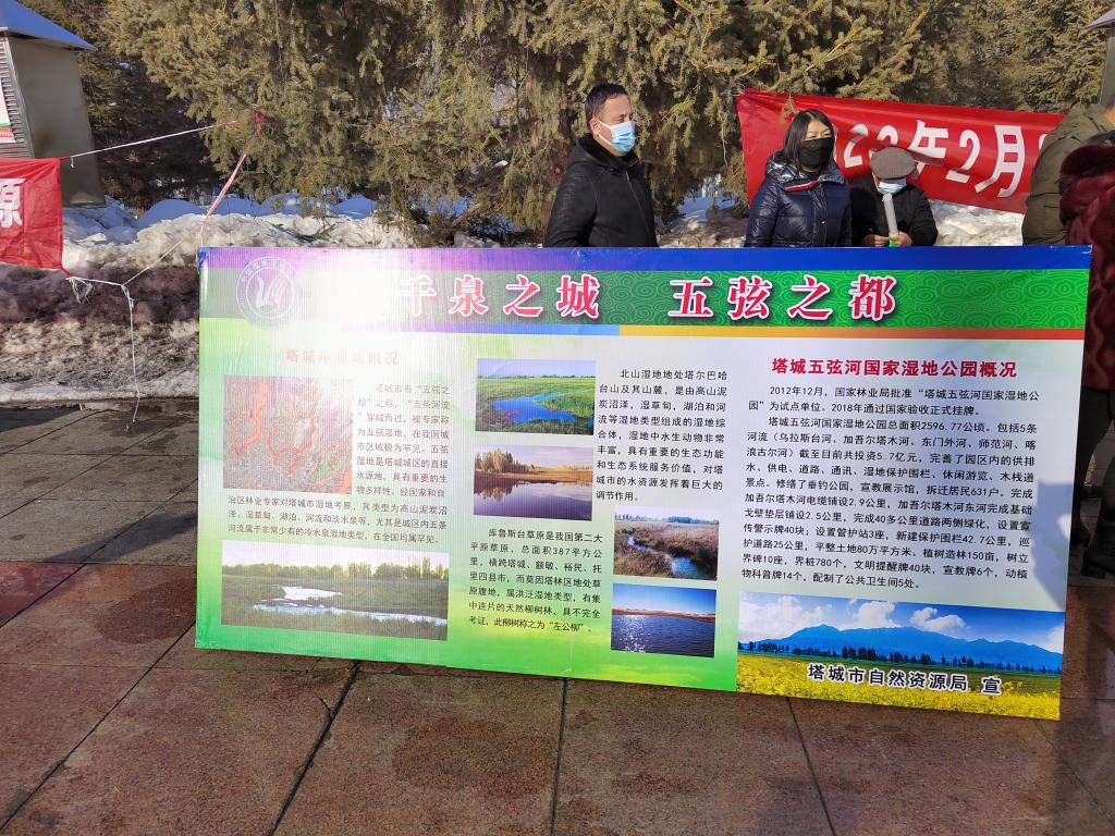 活動現場,擺放了“千泉之城 五弦之都”濕地科普展板,讓群眾更加了解塔城五弦河國家濕地公園。并懸掛“濕地修復 刻不容緩”橫幅、擺放“保護濕地人人有責”、“關注濕地 愛護水鳥”等標語牌,向廣大群眾宣傳了保護濕地的重要性。科普志愿者還發放了關于塔城五弦河國家濕地公園、中華人民共和國濕地保護法、國家濕地公園管理辦法、健康科普德宣傳手冊、環保購物袋等宣傳物品,進一步宣傳了保護濕地是我們每一個市民該做的事情。