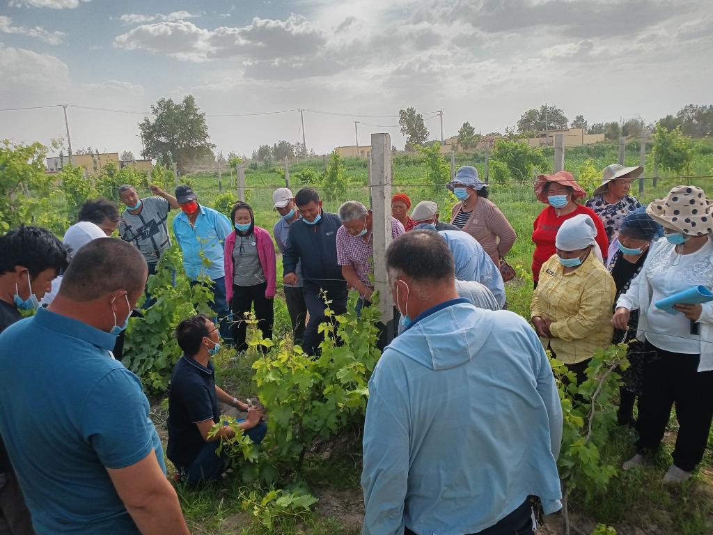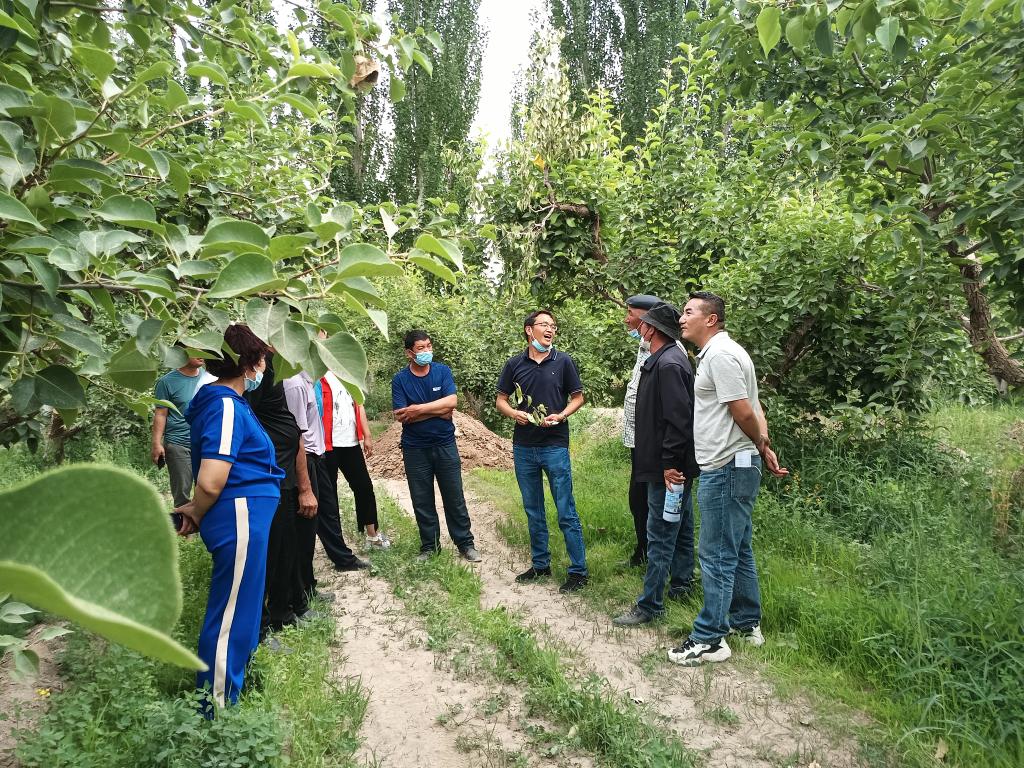 新疆農(nóng)科所園藝所研究員張校立、楊生保兩位專家介紹林果業(yè)和蔬菜種植的成果和經(jīng)驗,有效激發(fā)了農(nóng)牧民群眾對發(fā)展林果業(yè)和蔬菜種植的興趣和積極性。大家一起走向田間地頭,結(jié)合實際開展現(xiàn)場教學(xué),用通俗易懂、接地氣的語言給廣大群眾講解林果和蔬菜的種植、嫁接、修剪、病蟲害防治、施肥、澆水等技術(shù),并現(xiàn)場示范操作,現(xiàn)場氣氛火熱,并就林果業(yè)管理、蔬菜種植病蟲害防治及相關(guān)難點、重點與現(xiàn)場人員互動,答疑解惑。