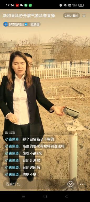 直播伊始,由科普志愿者通過通俗易懂的語言以沙盤為媒介介紹新和縣所處的地理位置及地形地貌。隨后,在氣象科普室講解新和縣主要的氣象災(zāi)害、怎樣預(yù)防氣象災(zāi)害以及各種氣象儀器,并積極與直播間觀眾互動(dòng),為他們答疑解惑。在新和縣氣象防災(zāi)減災(zāi)預(yù)警中心,科普志愿者演示了氣象數(shù)據(jù)采集系統(tǒng),帶大家了解新和縣各種數(shù)據(jù)點(diǎn),比如農(nóng)林站、危險(xiǎn)區(qū)等等。在戶外,為大家詳細(xì)介紹了氣象監(jiān)測(cè)站的原理及使用,帶大家觀察風(fēng)向和風(fēng)速,并為大家演示降水量測(cè)量過程,吸引直播間觀眾興趣。”