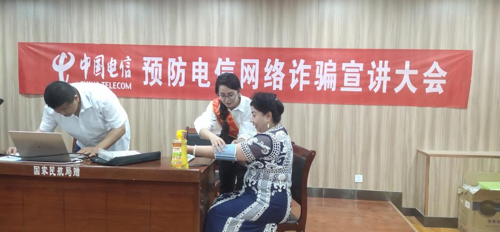 活動現場,發放《中華人民共和國反電信網絡詐騙法》《國家安全人人有責》宣傳冊、宣傳單頁60余冊(張)、播放宣傳視頻3個,為老人們測血糖,發放小禮品30多份。