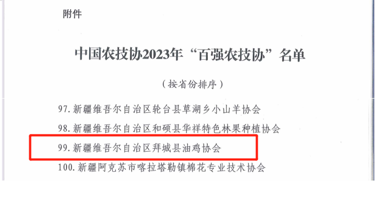 近日,中國農村專業技術協會發布《中國農技協關于公布2023年“百強農技協”選樹結果的通知》,全國100家農技協入選,其中,拜城油雞協會上榜全國“百強農技協”。
