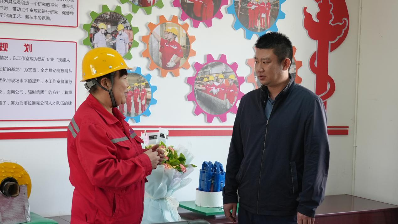 在喀拉通克礦業有限責任公司,王飛一行慰問了科技工作者代表熱西拉·熱哈提,并為她送上鮮花和慰問品,與她親切交談,詳細詢問工作生活、科研發展等情況,勉勵她發揮科學帶頭人作用,注重應用研究和人才培養,在促進科技成果轉化等方面作出更大貢獻。
