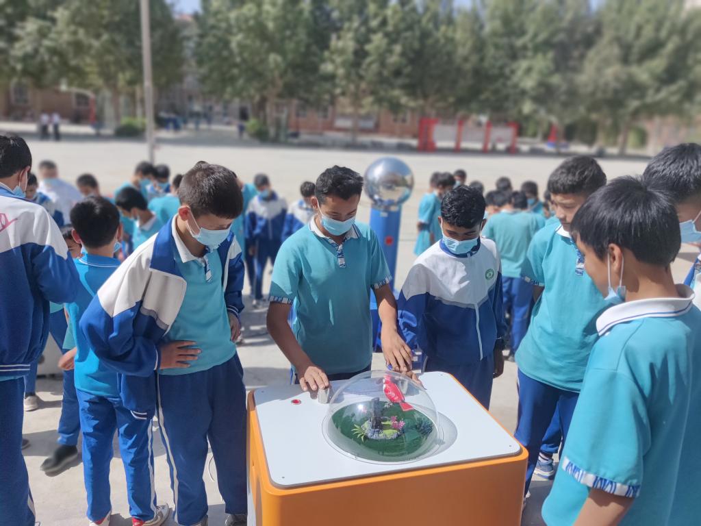 七年級3班的學生阿布拉江·亞森說:“看到今天的這些科普設(shè)備,我很興奮,觀察了師生的科技作品,我很佩服他們,雖然我還不懂這些知識,但是我會好好學習,也會向他們一樣制作出更好的科技作品。”