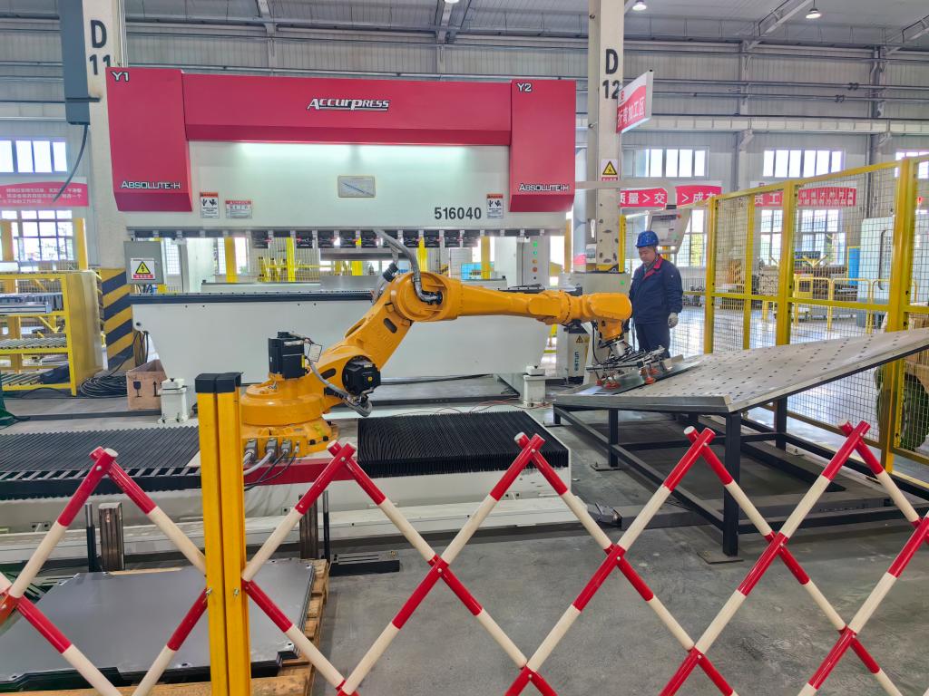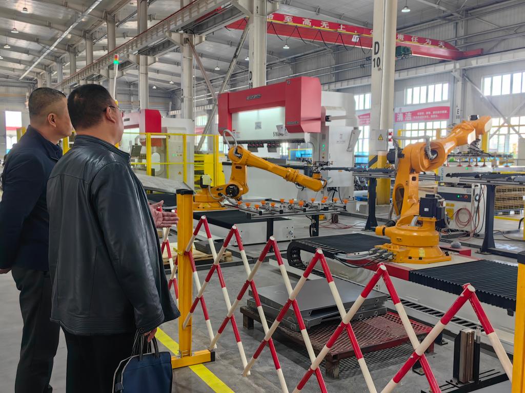5月5日,新疆缽施然農(nóng)業(yè)機械科技有限公司零件壓沖工段,多臺機械臂正在對采棉機需要的產(chǎn)品進行全自動生產(chǎn)。