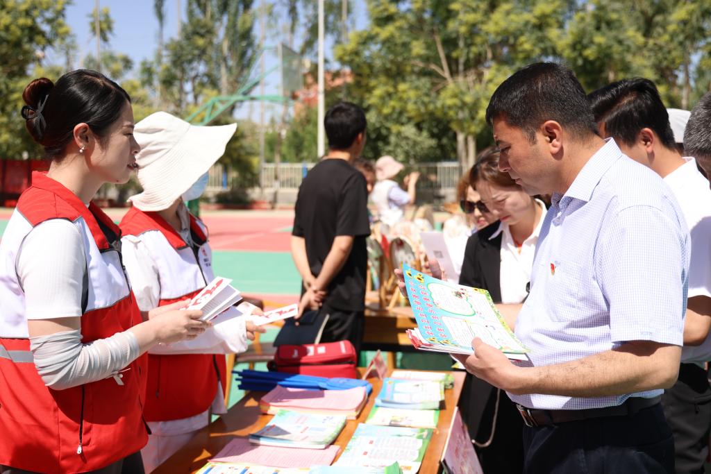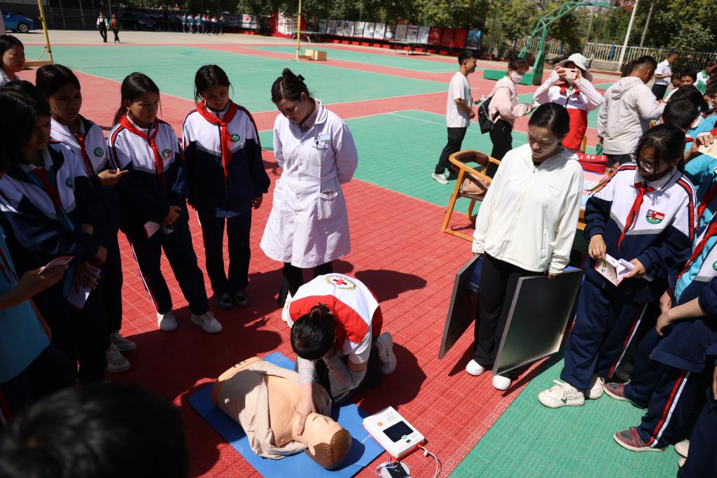 活動現(xiàn)場采取“文化+藝術(shù)”形式,吸引了在場的黨員干部及學生積極參與。葉城縣中等職業(yè)技術(shù)學校在現(xiàn)場擺放的蛋雕、木雕、塑造、石頭畫等藝術(shù)創(chuàng)作吸引力十足;文化館工作人員現(xiàn)場還展示剪紙技藝,引得學生們躍躍欲試;紅十字會工作人員宣傳了防溺水知識,用通俗易懂的語言,詳細講解了心肺復蘇的緊急處理方法和急救措施,并且對AED(自動體外除顫儀)使用進行了演示;司法局工作人員現(xiàn)場為大家普及了憲法、民法典等法律法規(guī)。通過一系列活動的開展讓科普知識深入群眾,服務百姓,提升大眾文化素養(yǎng)。