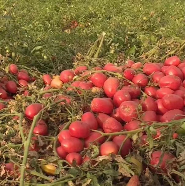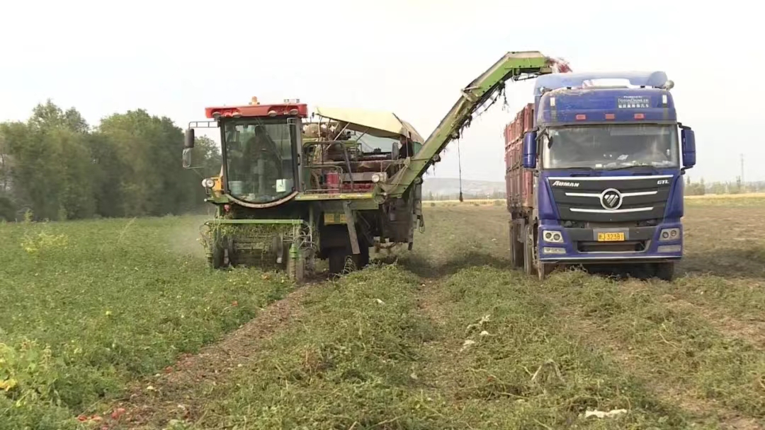 田地里,機聲轟鳴,自動化番茄采收機械來回穿梭,開足馬力采收番茄,一顆顆飽滿多汁的番茄隨著傳送帶落進拉運車輛,被送往加工廠。