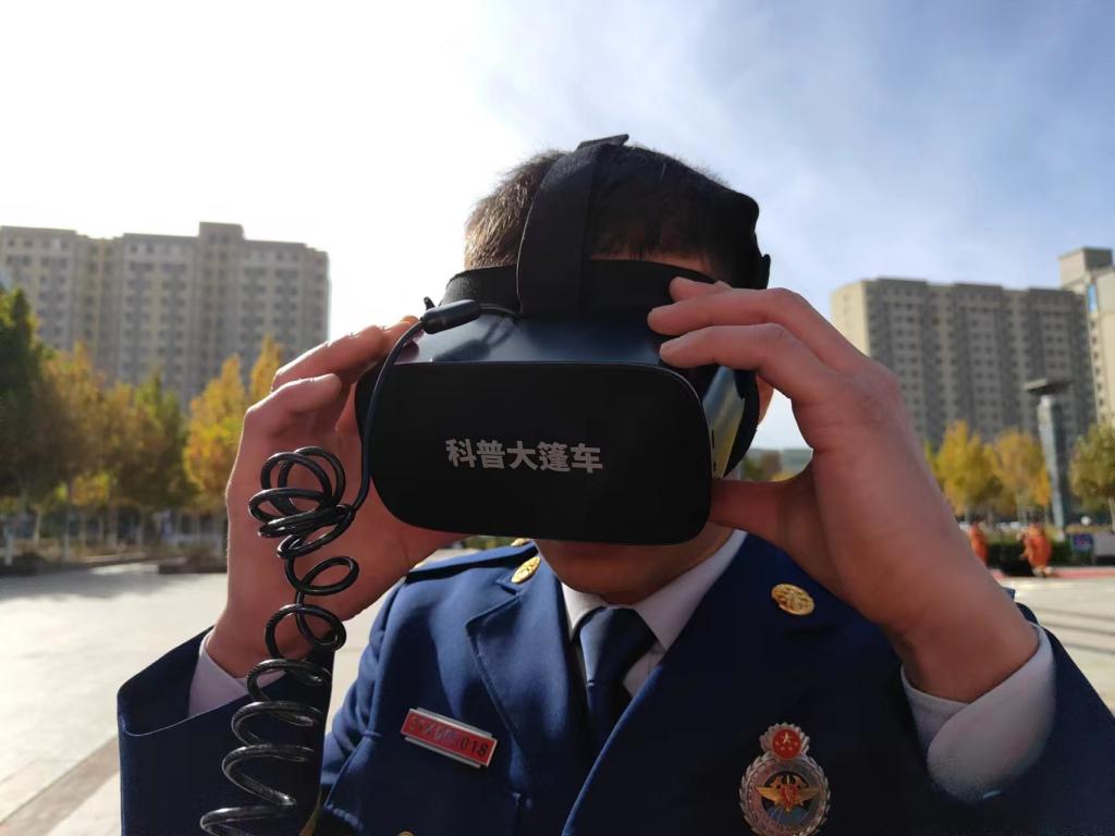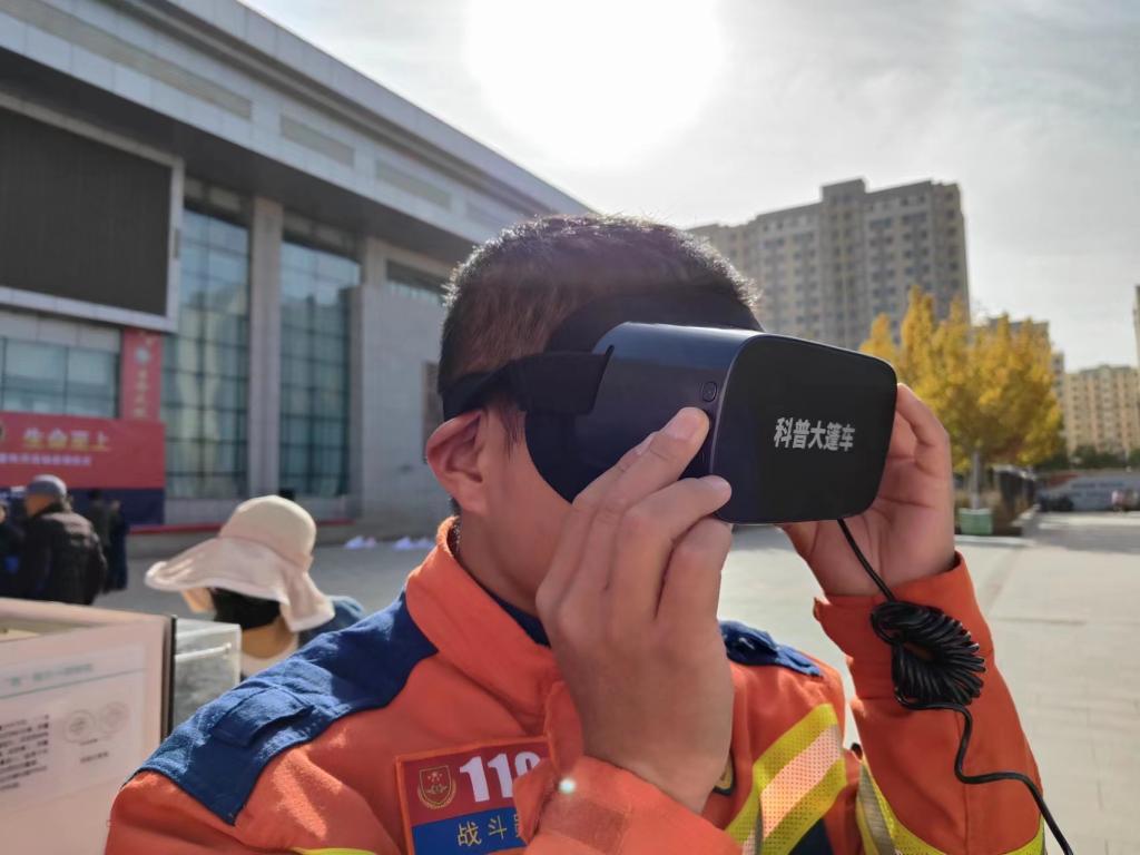 啟動儀式上對2023年度消防宣傳工作先進單位和個人進行表彰后,各成員單位紛紛開展消防安全主題展示活動,現(xiàn)場各類消防器材和消防車讓群眾感到耳目一新,充滿好奇。縣科協(xié)的科普大篷車和科普展教具更是讓人流連忘返,科技志愿者通過發(fā)放宣傳冊,擺放展板等方式詳細講解日常生活中安全用火、用電的注意事項及火災(zāi)的形成、發(fā)展和危害,如何正確撥打火警電話、火災(zāi)自救等消防安全常識。我們的消防員藍朋友也戴上VR眼鏡來體驗科學(xué)的魅力。百姓們通過VR眼鏡直觀體驗火災(zāi)發(fā)生的情景,直呼“真是太神奇了,簡直身臨其境。”。