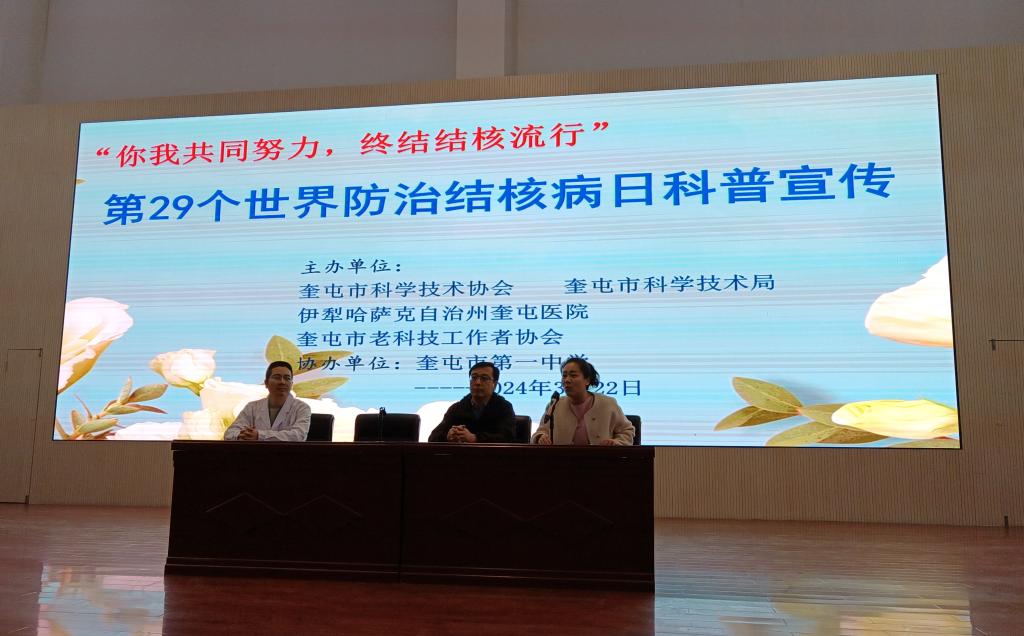 為進一步提高市民群眾對結(jié)核病危害性的認識,科學(xué)防治結(jié)核病,結(jié)合奎屯市第29個“世界防治結(jié)核病日”活動安排,3月22日,奎屯市科協(xié)聯(lián)合市科技局、老科協(xié)、伊犁州奎屯醫(yī)院在奎屯市第一中學(xué)開展“你我共同努力,終結(jié)結(jié)核流行”科普宣傳活動。