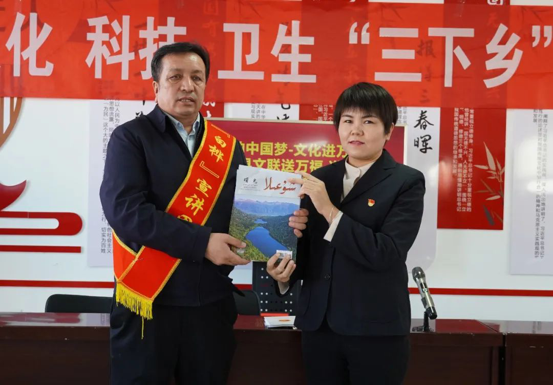 活動中,哈巴河縣“白樺”冬不拉小分隊成員、文藝愛好者以及村民自編自演的詩歌朗誦、阿肯彈唱、冬不拉彈奏、歌曲等精彩文藝節目,展現了村民依靠黨的惠民政策走向致富路的幸福場景,發自內心地聽黨話、感黨恩、跟黨走的信心和決心。隨后,縣文聯為該村贈送了《新疆維吾爾自治區社會科學普及條例》《曙光》雜志。