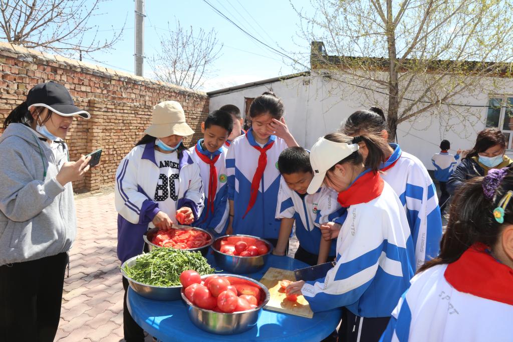 學生代表254人模擬長征路,從學校一路徒步到江格斯鄉“7080·年代印象”科普教育基地,進行互動感恩教育、科普教育、勞動教育和生活技能體驗課?;顒又?,科技輔導員與學生通過共話勞動節的來歷,勞動模范的事跡,增進對“勞動創造幸?!钡睦斫狻F陂g,同學們有的輪起鋤頭對種植基土進行深翻,有的對已栽培的菜苗進行拔草,有的對小苗小心的移栽。同學們一邊向老師學習種植方法,一邊親自實踐,一派火熱的勞動情景。