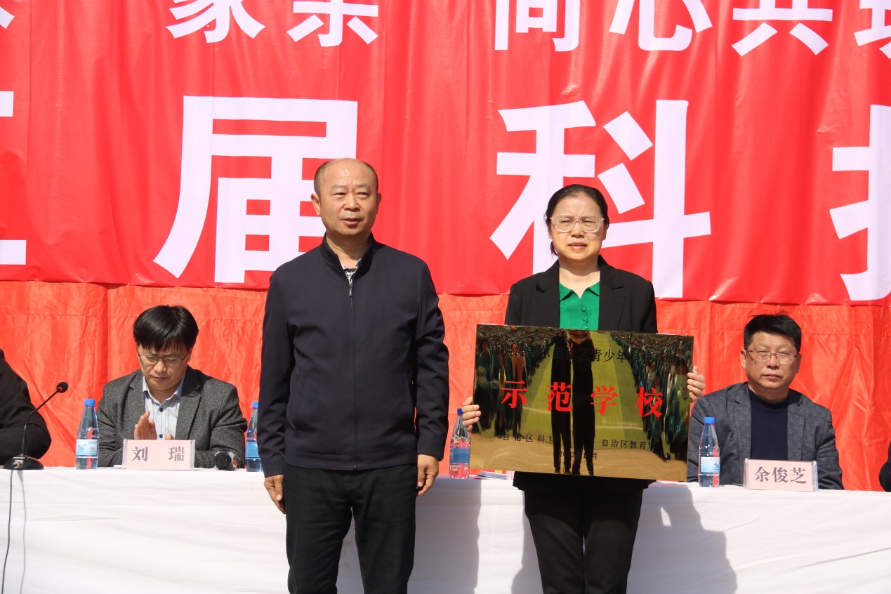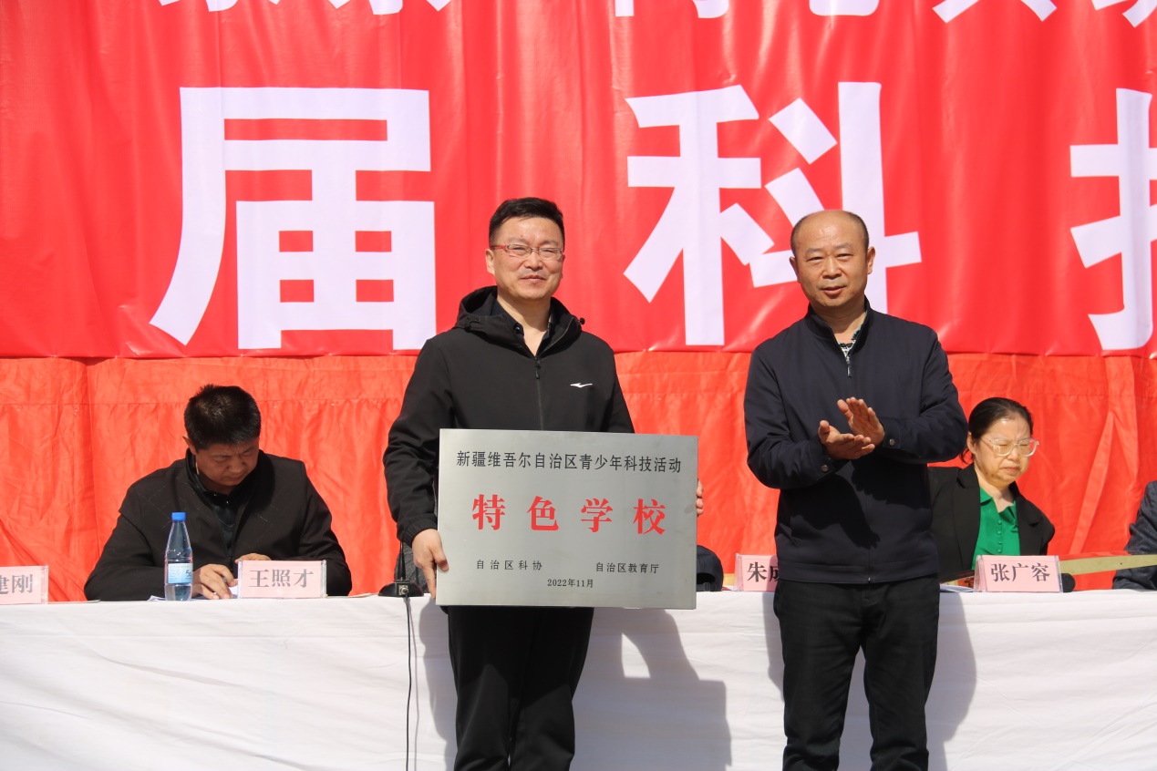 朱成強為沙灣市第一中學和沙灣市第一小學頒發2022年自治區科技特色示范學校牌匾,為沙灣一中教師、沙灣市科技輔導員宋珂平老師頒發中國科協科普部授予的2022年全國科普優秀志愿者證書。