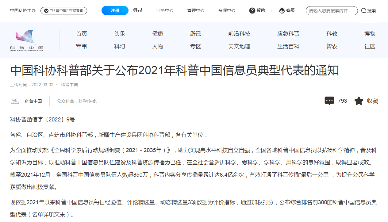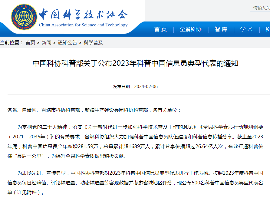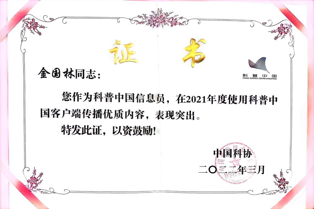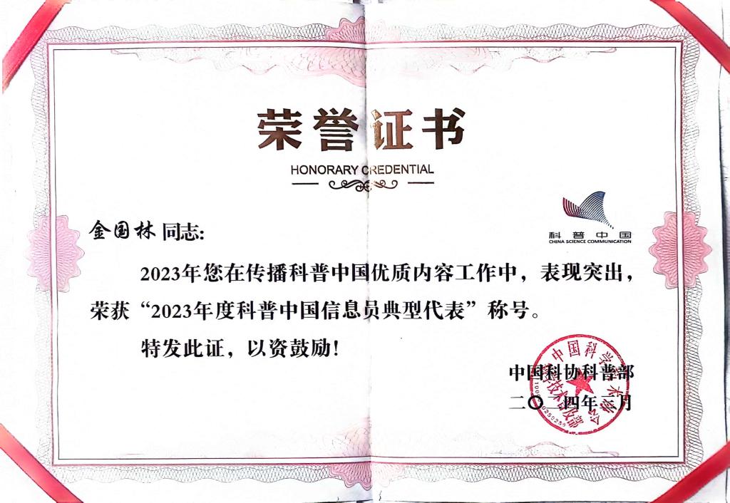 近日,中國(guó)科協(xié)科普部公布了《關(guān)于2023年科普中國(guó)信息員典型代表的通知》,阜康市科技局二級(jí)主任科員金國(guó)林同志榮獲“2023年科普中國(guó)信息員典型代表”稱號(hào),這是該同志繼獲得“2021年科普中國(guó)信息員典型代表”后再次受到中科協(xié)的表?yè)P(yáng)。