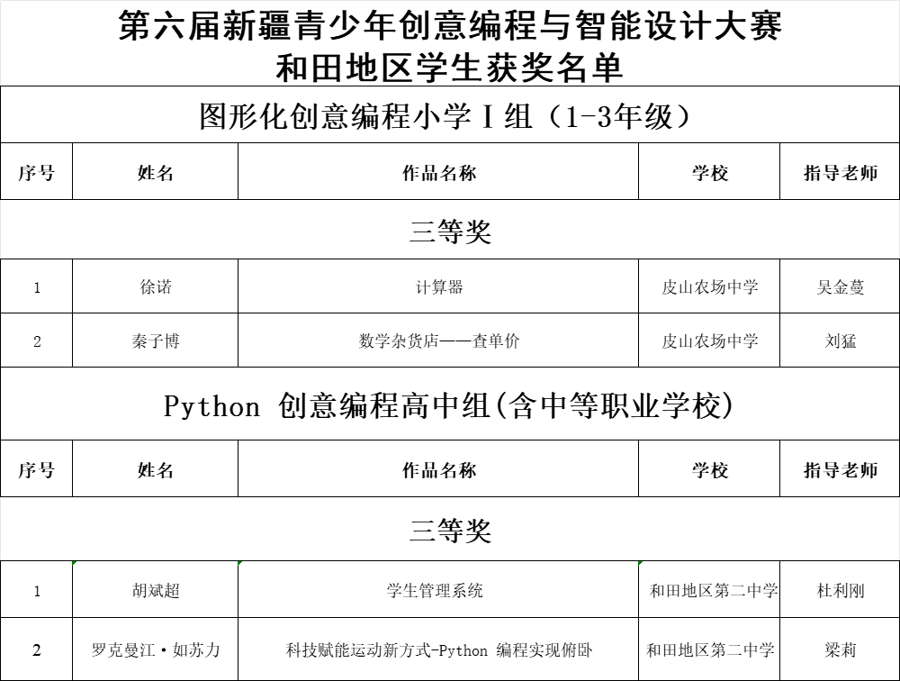 在本次大賽線上舉辦的初賽中,經過激烈角逐,和田地區5名學生在圖形化創意編程小學Ⅰ組(1-3年級)項目、圖形化創意編程初中組項目、Python創意編程高中組(含中等職業學校)項目等三個賽事項目中表現不俗,入圍自治區復賽,最后在復賽中4名學生獲獎。