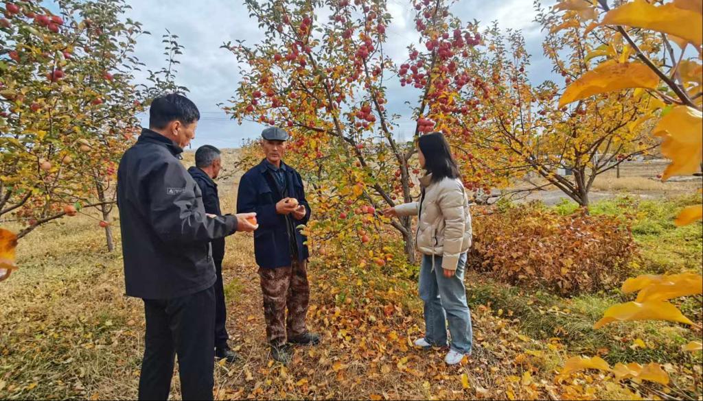 在恰庫爾圖鎮(zhèn),技術專家親自示范,帶領工作人員對鎮(zhèn)區(qū)的果樹和綠化樹種進行清理、修剪和開展施肥。在哈希翁村巴哈提庭院,一畝多地的蘋果園還掛著許多蘋果。除去賣掉的700公斤外,果園還有一噸半蘋果,預計收益可達2萬余元。技術專家一邊商量幫助巴哈提銷售蘋果,一邊指導他把蘋果摘下來入窖儲存,并針對蘋果在果梗和花萼出現(xiàn)裂口現(xiàn)象給予解答。