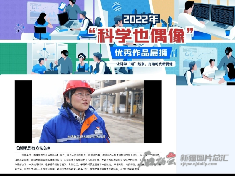 新疆5部獲獎(jiǎng)作品包括:中國(guó)石油新疆油田公司勘探開發(fā)研究院趙龍作品《滾滾油流涓涓愛——覃建華科技報(bào)國(guó)事跡短片》(二等獎(jiǎng));新疆氣象學(xué)會(huì)、新疆氣象服務(wù)中心伊力哈木作品《綠色生態(tài)工匠——毛煒嶧》(三等獎(jiǎng));新疆植物學(xué)會(huì)康曉珊作品《科研工作者的生命永遠(yuǎn)年輕》 、新疆維吾爾自治區(qū)中藥民族藥研究所趙亞琴作品《邊疆中藥人——李曉瑾團(tuán)隊(duì)》、山東能源集團(tuán)新疆能化公司李響作品《創(chuàng)新是有方法的》(優(yōu)秀視頻)。
