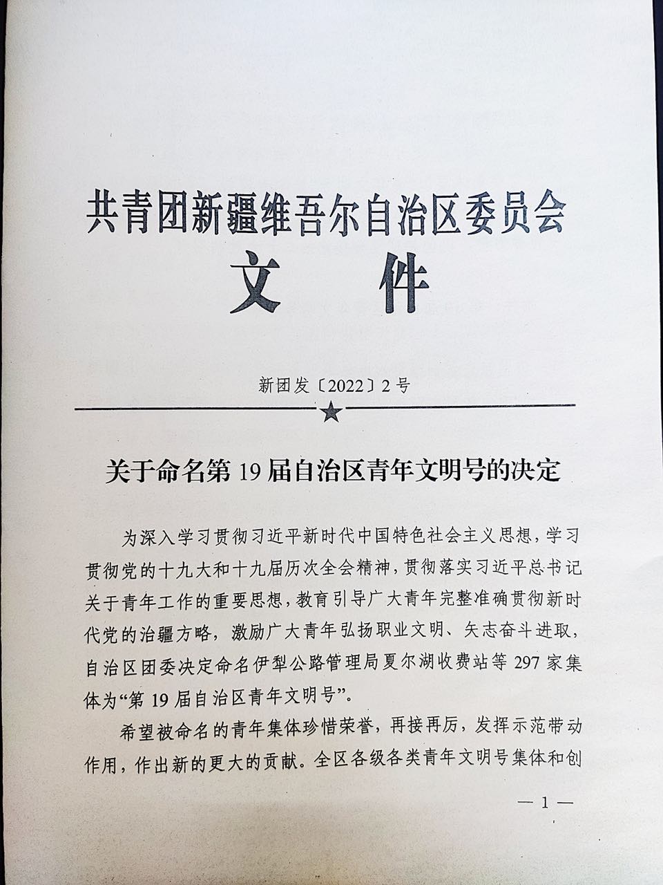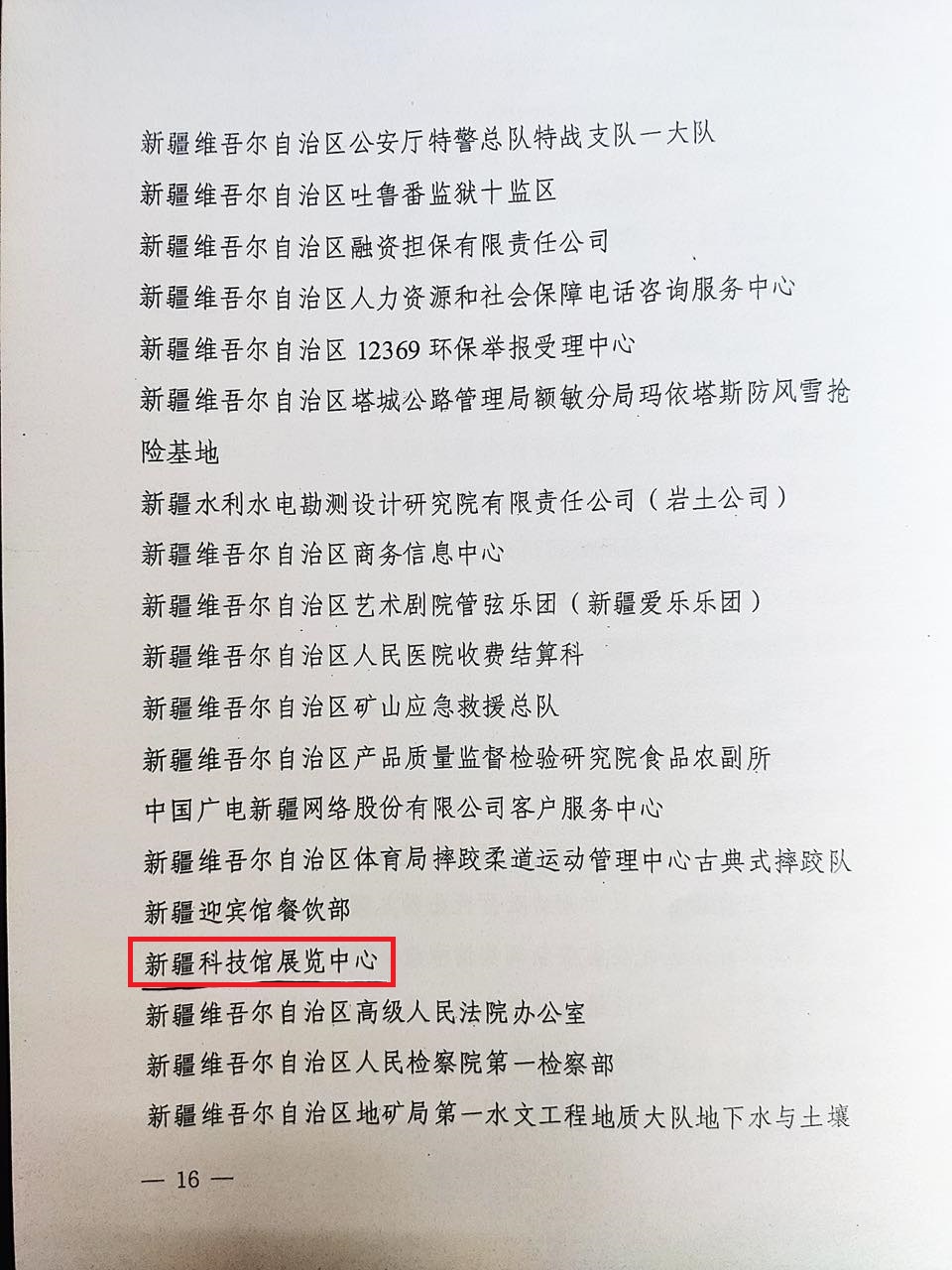 根據共青團新疆維吾爾自治區委員會《關于命名第19屆自治區青年文明號的決定》(新團發【2022】 2號),新疆科技館展覽中心榮獲“第19屆自治區青年文明號”榮譽稱號。