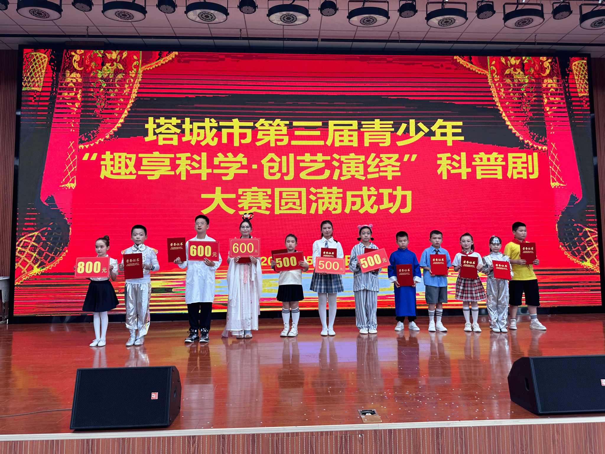 比賽當天,來自塔城市11所小學的124名演員們帶來了精彩絕倫的表演。參賽形式豐富多樣,涵蓋小品、相聲、舞臺劇、音樂劇等多種類型。作品內容緊扣科技興國、科普健康、智能AI等主題,以倡導健康科學的生活方式為導向,既展現了科學知識的魅力,又融入了藝術表演的感染力。舞臺上,小演員們語言流暢、動作自然,服裝設計貼合劇情,舞臺布置巧妙,將一個個科學故事生動呈現,贏得現場觀眾陣陣掌聲。評委們從科學知識和表演兩大維度進行嚴格打分,最終評選出一等獎1個、二等獎2個、三等獎3個、優秀獎5個,并為獲獎學校頒發獎牌、獎金和科學實驗包。