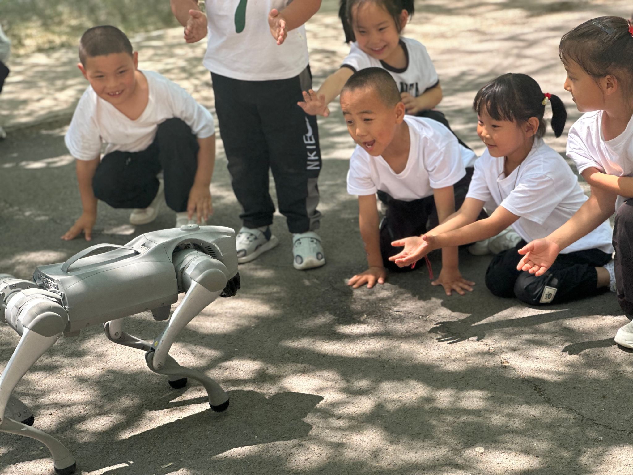 最受學生關注的當屬"機械狗"展示區。這些具備智能交互功能的機械狗,能完成前進、轉向、跳躍等動作,吸引了大量學生駐足觀察。工作人員通過現場操控演示,講解機械狗的動力系統與智能控制原理,激發了同學們對人工智能與機器人技術的濃厚興趣。