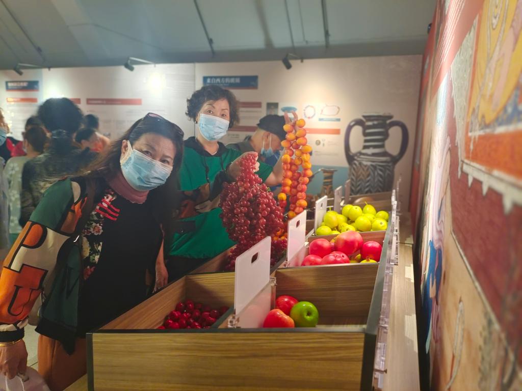 居民群眾在講解員的講解下還深刻了解了當時的文化、經濟發展、還有當時人們的生活。在講解到我們現在所吃的水果及蔬菜大多都是當時通過絲綢之路傳入我們中國的,居民們都很欣喜,拿著葡萄、杏子的模型招呼大家觀看。