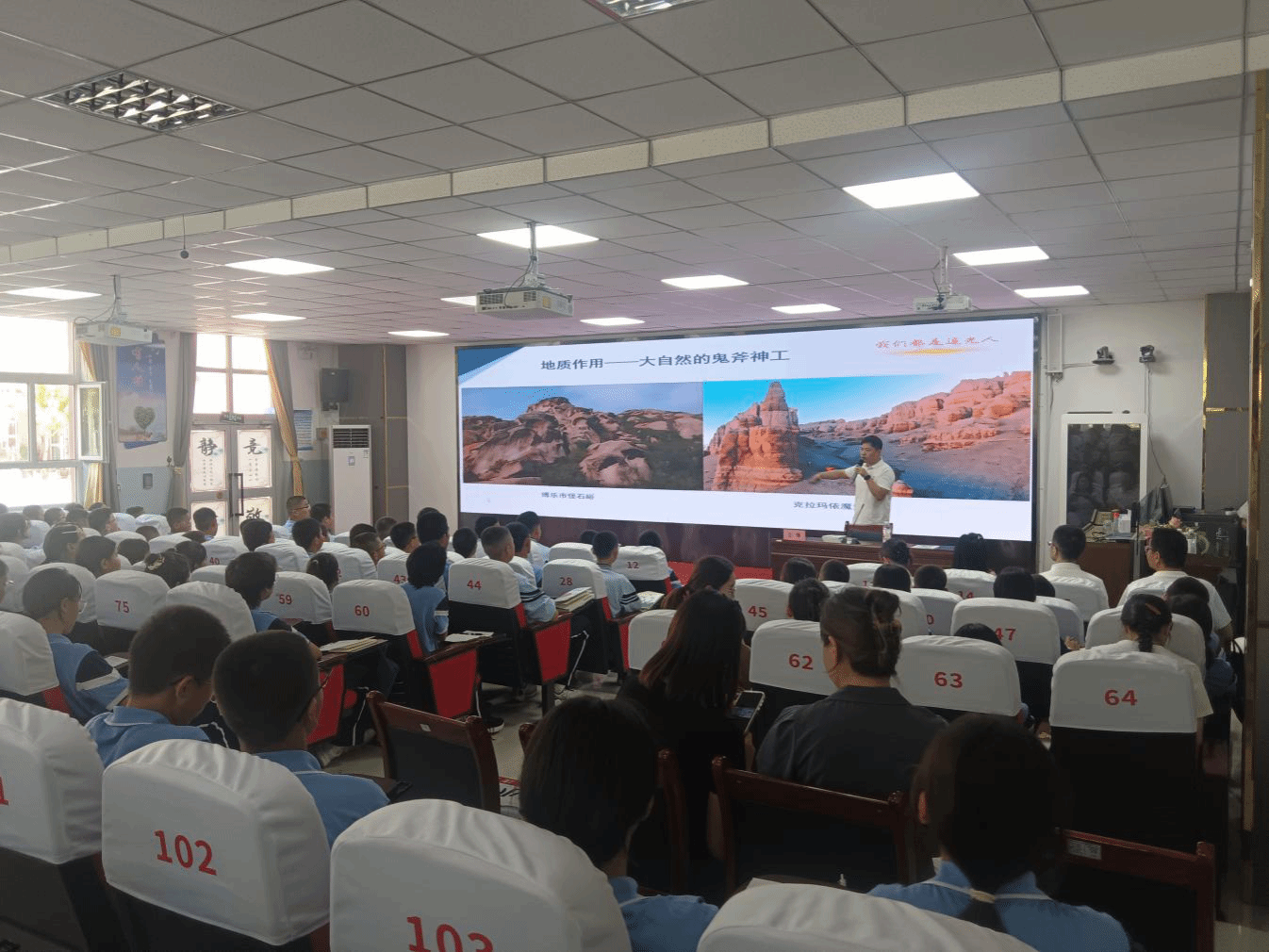 活動中,湖北省地質局地學科普首席專家王鏑以“探尋地球密碼,走進地質世界”為主題,穿越地球46億年演化歷史,闡釋地質與生活的聯系。“看似普通的石頭,承載著地球演化的史詩”,王鏑通過介紹新疆和湖北各類地貌景觀,揭示地球演化的規律。王老師圖文并茂地向同學們介紹了地質研究在資源開發、災害預防和環境保護中的重要作用,并鼓勵同學們在未來探尋地質奧秘。