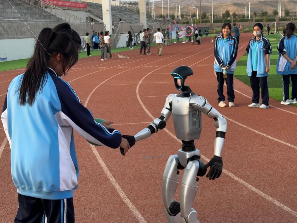 “快看!機器狗會打滾作揖!還會伸懶腰!”伴隨著學生們的歡呼,機器人展區瞬間成為校園里最熱鬧的“科技樂園”。炫酷十足的機器人時而揮動手臂打招呼,時而抬腿叉腰擺造型,時而秀一段霹靂舞蹈技能。同學們圍在機器狗、機器人周圍,眼睛緊緊盯著它們的一舉一動,歡呼雀躍聲此起彼伏,回蕩在開幕式的每個角落。
