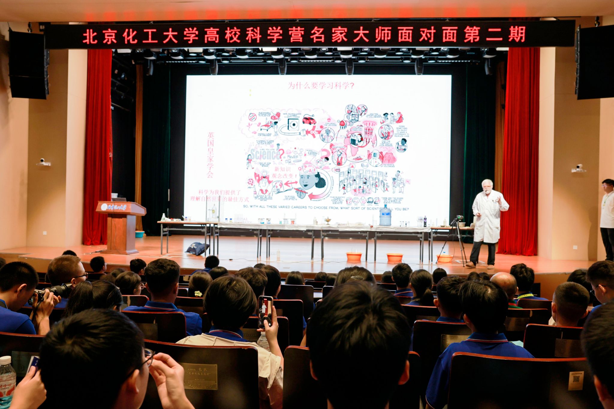 北京化工大學(xué)校長(zhǎng)譚天偉院士以《化工:塑造美好未來(lái)》為題,從綠色可持續(xù)技術(shù)到支撐航天航空的尖端材料,深刻闡述了化工科技在國(guó)家戰(zhàn)略中的支柱作用。戴偉教授的化學(xué)魔法秀,液氮的星雨與量子的舞步交織,將抽象的科學(xué)原理化為令人驚嘆的視覺(jué)盛宴。張麗丹教授傳授的高效學(xué)習(xí)方法論,為學(xué)子們跨越知識(shí)斷層提供了有力工具。楊衛(wèi)民教授對(duì)高分子材料前沿的展望,激發(fā)了年輕一代投身科技創(chuàng)新的無(wú)限憧憬。校史講座中,“五老”成員深情講述北化創(chuàng)業(yè)維艱的歷程,將“宏德博學(xué),化育天工”的校訓(xùn)精神深深烙印在巴州學(xué)子心中。物理、化學(xué)、虛擬現(xiàn)實(shí)(VR)等前沿實(shí)驗(yàn)室的沉浸式體驗(yàn),更讓書本知識(shí)變得觸手可及、生動(dòng)鮮活。